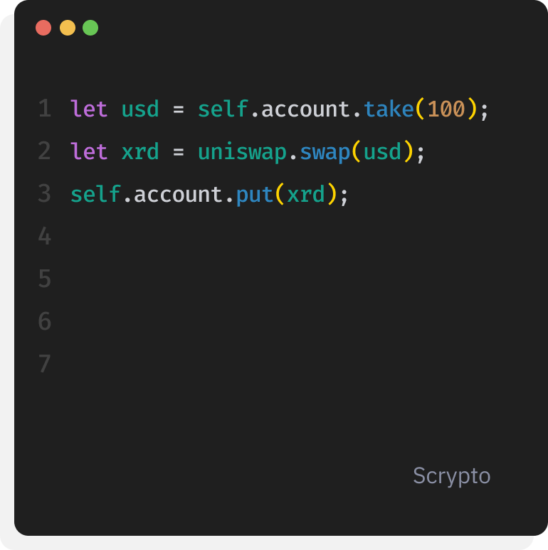 Scrypto is based on Rust, providing the powerful and expressive logic of one of the best-loved languages today, while adding asset-oriented primitives and functions that let the developer focus on quickly programming finance, not programming a blockchain.